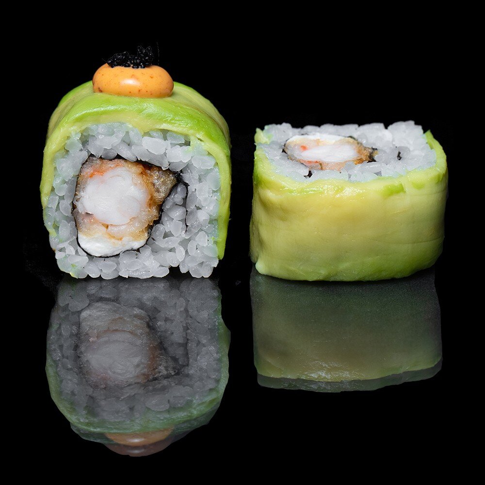 рис, нори, сливочный сыр, авокадо, креветка темпура, икра тобико, спайси соус