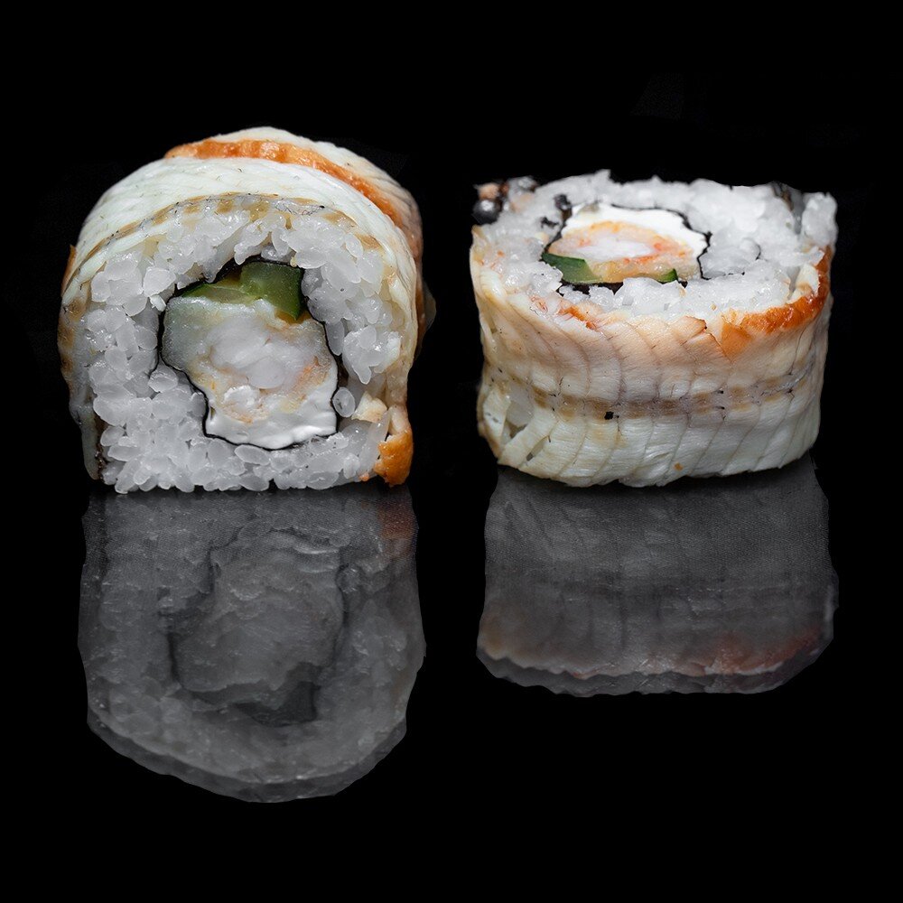 рис, нори, сливочный сыр, угорь, креветка темпура, авокадо