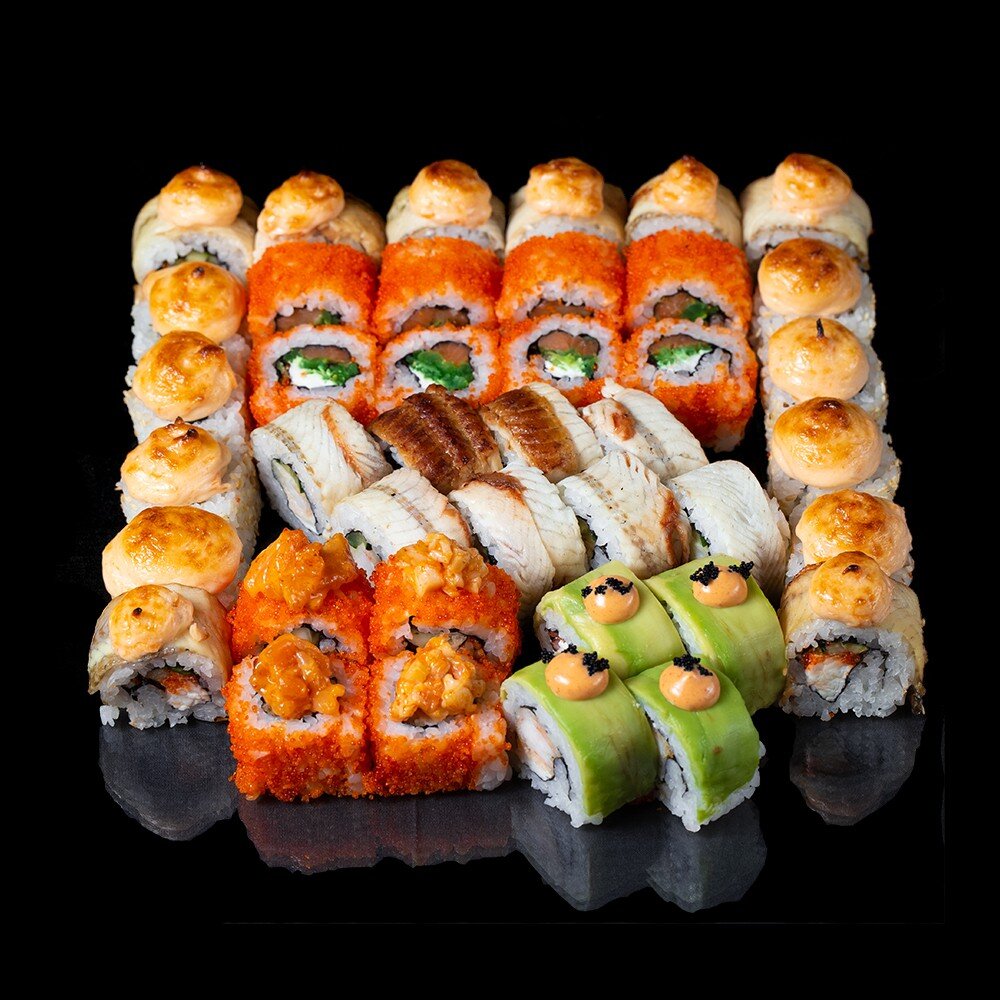 Эби сяке кранч (4шт), Эби авокадо (4шт), Дракон запеченный (8шт), Тоттори (8шт), Сяке чукка (8шт), Мияко (8шт)