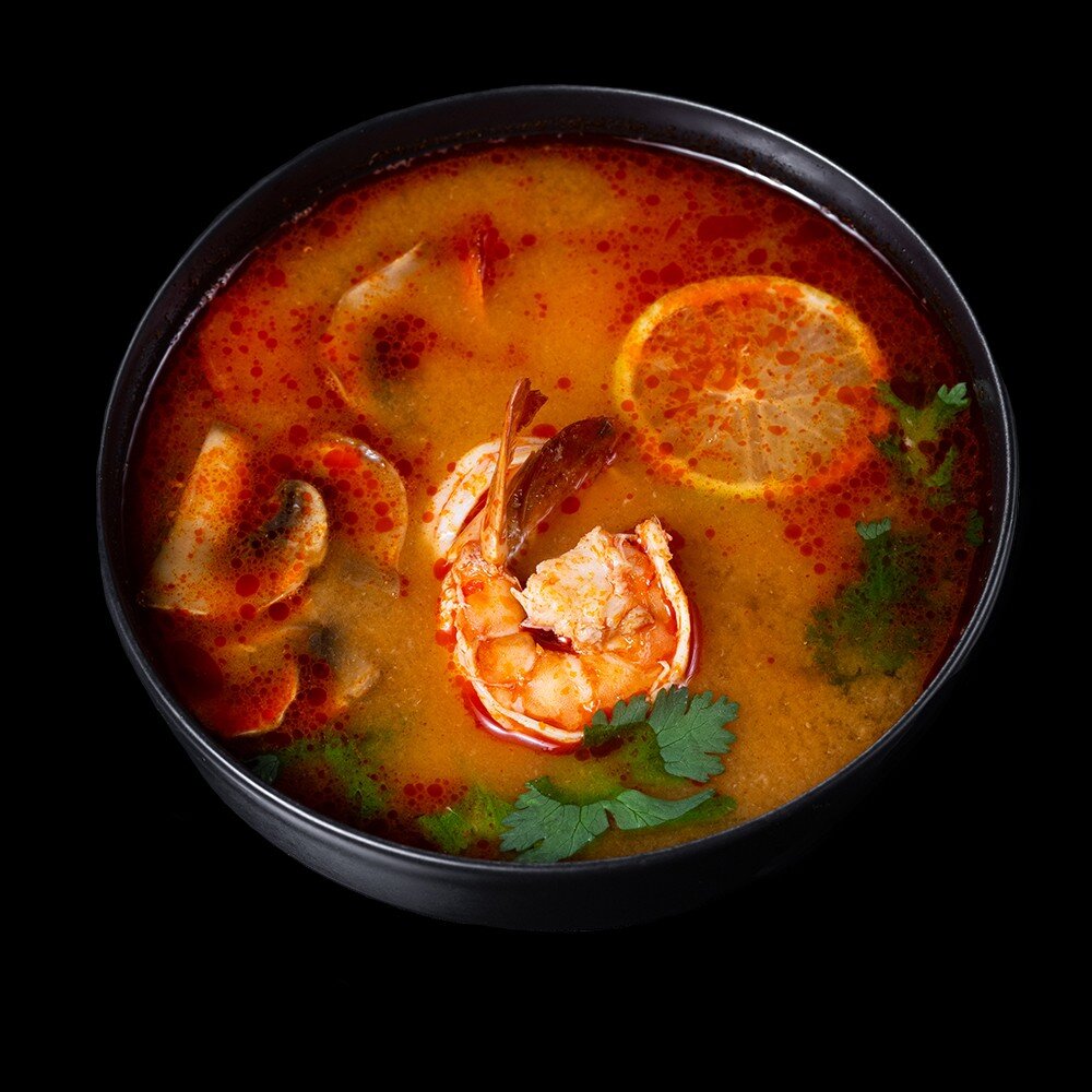 куриный бульон, том ям паста, шампиньоны, черри, королевские креветки, кальмары, мидий, осьминог